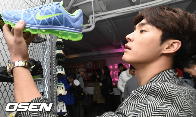 배우 서하준이 전시된 운동화를 관람하고 있다.