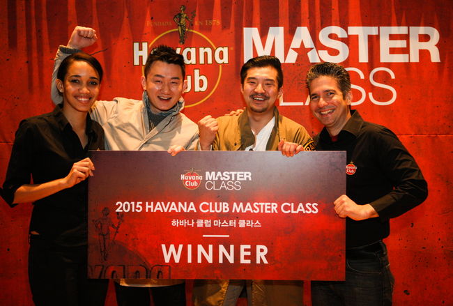 2015 하바나 클럽 마스터 클래스 우승자들이 포즈를 취하고 있다. 왼쪽부터 애나벨 에르난데즈 글로벌 앰버서더, 박성민, 한동진, 파벨 페르난데즈 글로벌 바텐더 / 페르노리카 코리아 제공