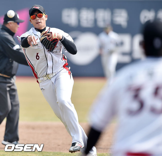 21일 수원케이티위즈파크에서 열린 '2015 타이어뱅크 KBO 리그 시범경기' kt 위즈와 KIA 타이거즈의 경기, 1회초 1사 KIA 이종환의 2루수 병살타때 kt 박경수가 병살로 처리하고 있다.