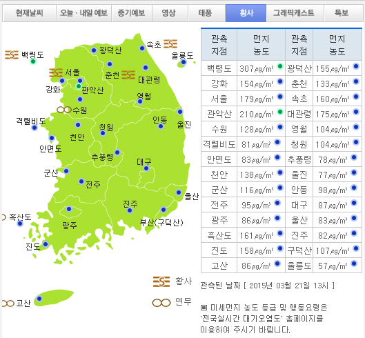 기상청은 이날 내몽골에서 발원한 황사가 주로 북한상공으로 지나가겠으나, 그 중 일부가 남하해 현재 서울, 경기서해안과 서해5도, 강원중북부지역에 옅은 황사가 관측되고 있다고 밝혔다.