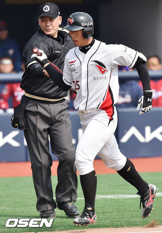 21일 수원케이티위즈파크에서 열린 '2015 타이어뱅크 KBO 리그 시범경기' kt 위즈와 KIA 타이거즈의 경기, 5회말 kt 선두타자 김사연이 좌월 솔로 홈런을 날린 후 홈에서 배트를 받고 있다.