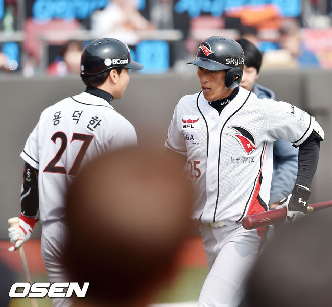21일 수원케이티위즈파크에서 열린 '2015 타이어뱅크 KBO 리그 시범경기' kt 위즈와 KIA 타이거즈의 경기, 5회말 kt 선두타자 김사연이 좌월 솔로 홈런을 날린 후 홈에서 용덕한과 하이파이브를 하고 있다.