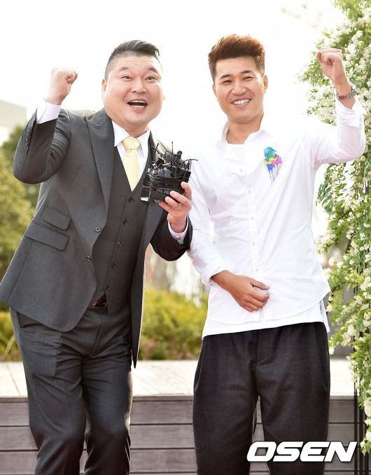21일 오후 서울 서초구 FIC 플로팅 아일랜드 컨벤션에서 진행된 조달환 결혼식전 포토월에서 강호동과 김종민이 포토타임을 갖고 있다.