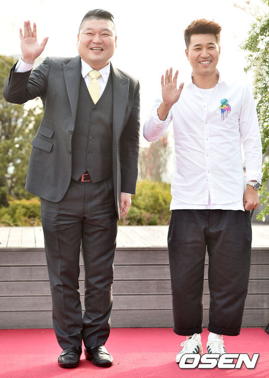 21일 오후 서울 서초구 FIC 플로팅 아일랜드 컨벤션에서 진행된 조달환 결혼식전 포토월에서 강호동과 김종민이 포토타임을 갖고 있다.