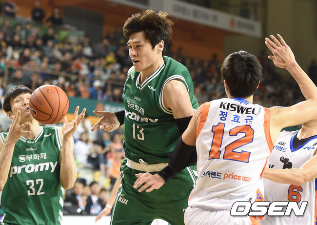 3쿼터, 동부 윤호영이 김주성에게 노룩패스를 하고 있다.