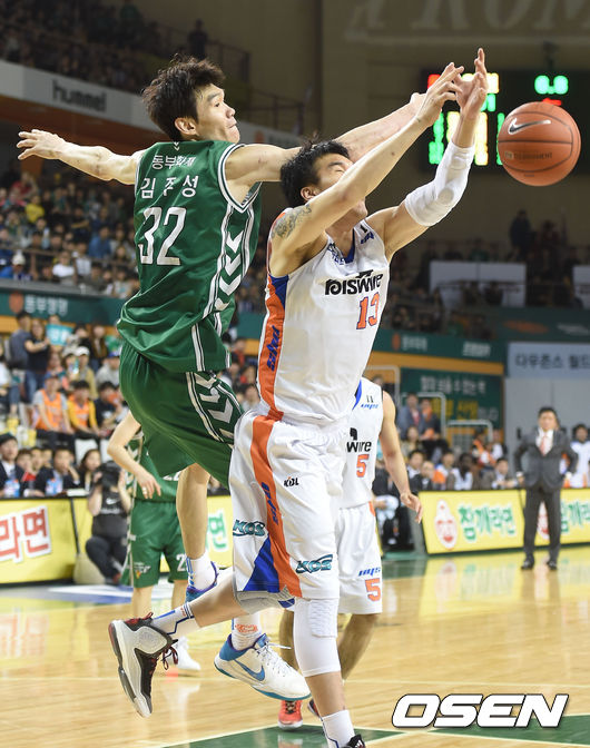 3쿼터, 동부 김주성과 전자랜드 주태수가 리바운드를 다투고 있다.
