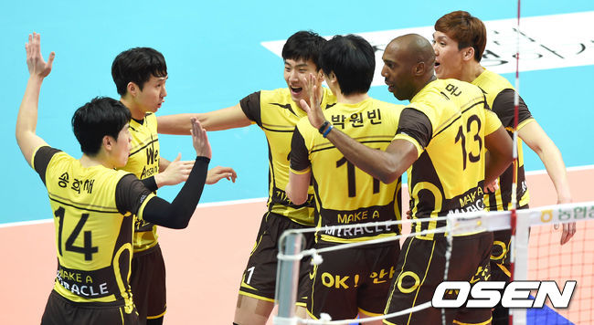 OK저축은행은 21일 안산 상록수체육관에서 열린 2014-2015시즌 NH농협 남자부 플레이오프 1차전 수원 한국전력 빅스톰과 경기서 세트스코어 3-2(41-39, 18-25, 25-16, 17-25, 15-8) 승리를 거뒀다.