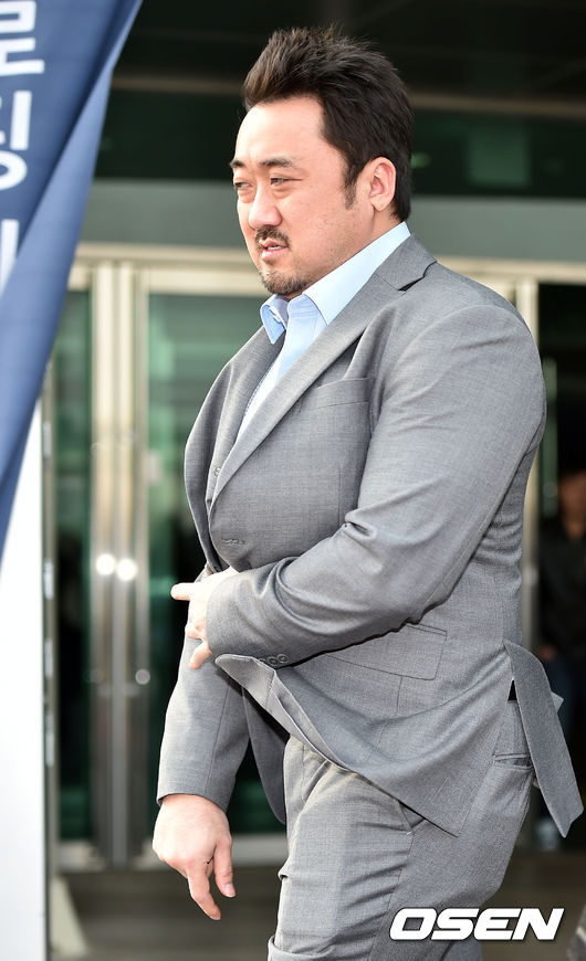 21일 오후 서울 서초구 FIC 플로팅 아일랜드 컨벤션에서 진행된 조달환 결혼식전 포토월에서 마동석이 바람을 뚫고 입장하고 있다.