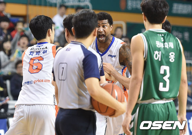 4쿼터, 전자랜드 포웰이 심판의 판정에 항의하고 있다.