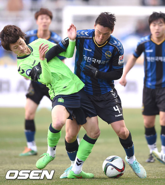 22일 오후 인천 축구전용경기장에서 열린 인천 유나이티드와 전북 현대의 경기, 전반 인천 김원식과 전북 이재성이 몸싸움을 펼치고 있다.