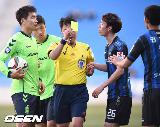 22일 오후 인천 축구전용경기장에서 열린 인천 유나이티드와 전북 현대의 경기, 후반 인천 권완규가 경고누적으로 퇴장당하고 있다