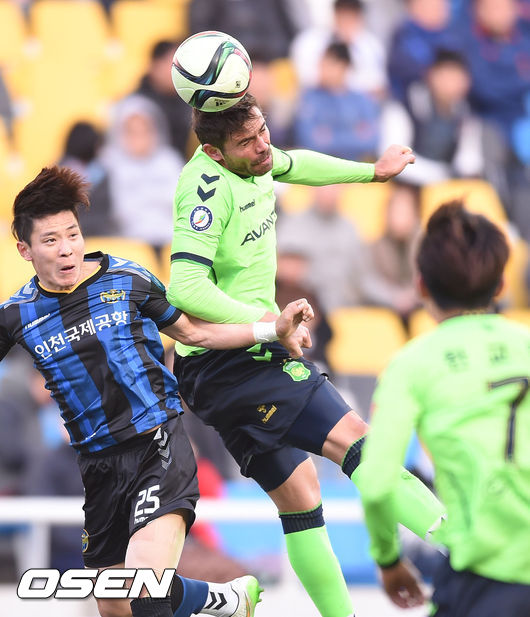 22일 오후 인천 축구전용경기장에서 열린 인천 유나이티드와 전북 현대의 경기, 후반 전북 에두가 헤딩을 하고 있다.