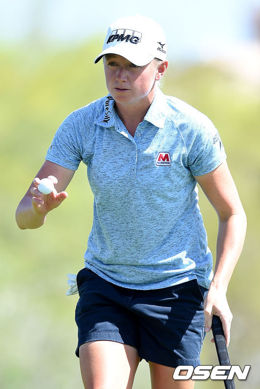 스테이시 루이스가 퍼팅을 성공한 뒤 캐디에게 공을 건네고 있다.