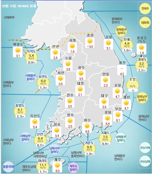 기상청에 의하면 23일 중국 중부지방에서 위치한 고기압의 영향을 받아, 전국이 맑겠다.