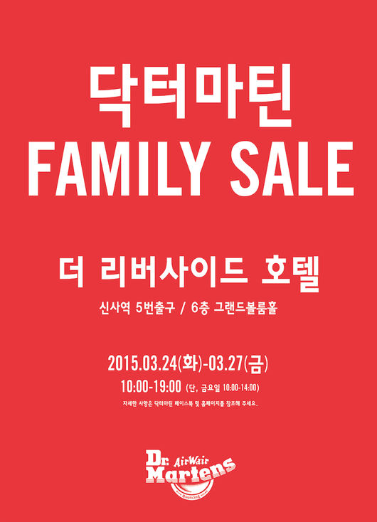 오는 24일부터 27일까지 4일간 진행되는 패밀리 세일은 강남구 신사역 인근에 더 리버사이드 호텔 6층 그랜드볼륨에서 진행되며 80~40%의 할인율을 적용한 220여종의 닥터마틴 대표 아이템 들을 3~9만 원대 가격에 만날 수 있다.