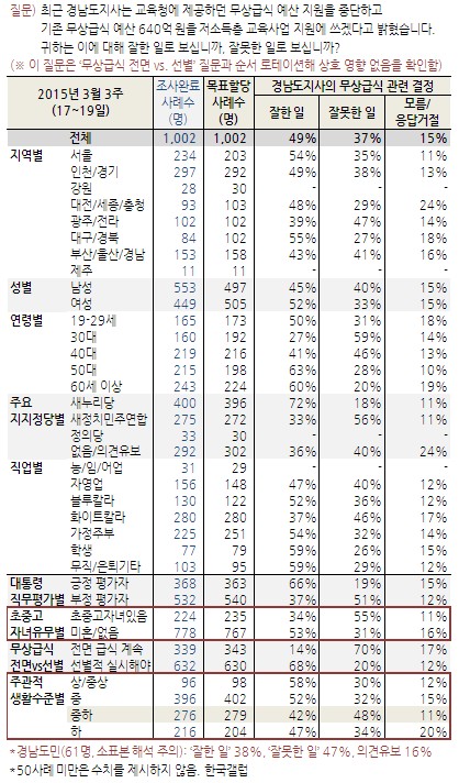 경남도의 이번 결정은 무엇보다 현재 무상급식 수혜 대상인 초중고 학부모에게 크게 와닿는 문제일 것이다. 실제로 현재 초중고 자녀가 있는 사람(235명)은 55%가 '잘못한 일'로 봤으나, 비수혜자(미혼 등 해당 연령대 자녀가 없는 사람 767명) 중에서는 53%가 '잘한 일'로 평가해 입장이 상반됐다.