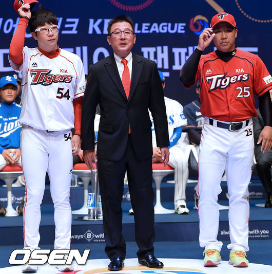 23일 오후 서울 이화여대 ECC 삼성홀에서 진행된 '2015 타이어뱅크 KBO 미디어데이 & 팬페스트'에서 KIA 김기태 감독과 양현종, 이범호가 인사를 하고 있다.