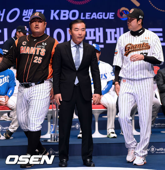 23일 오후 서울 이화여대 ECC 삼성홀에서 진행된 '2015 타이어뱅크 KBO 미디어데이 & 팬페스트'에서 롯데 이종운 감독과 최준석, 조정훈이 인사를 하고 있다.