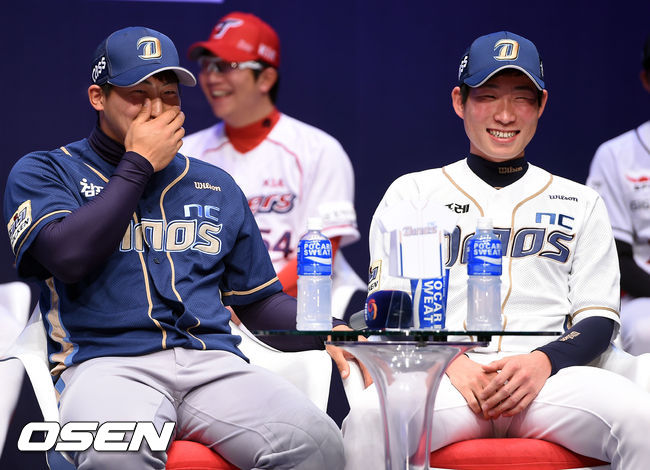 23일 오후 서울 이화여대 ECC 삼성홀에서 진행된 '2015 타이어뱅크 KBO 미디어데이 & 팬페스트'에서 NC 나성범과 이재학이 우승공약을 말하고 있다