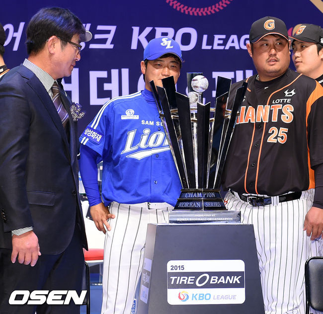 23일 오후 서울 이화여대 ECC 삼성홀에서 진행된 '2015 타이어뱅크 KBO 미디어데이 & 팬페스트'에서 삼성 류중일 감독과 박석민이 트로피를 바라보고 있다