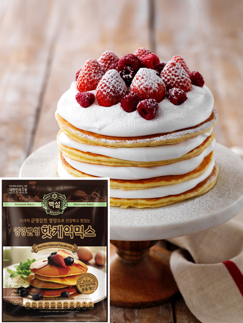 과일 밀푀유 케이크를 쉽게 만드는 비법은 핫케익믹스 가루에 있다. 밀가루를 기반으로 크레이프나 핫케이크를 쉽게 만들 수 있도록 만들어졌는데, 특히 '백설 영양균형 핫케익믹스'는 탄수화물 과다 섭취에 대해 걱정하는 소비자들을 위해 탄수화물을 줄이고 단백질의 균형을 맞춰 건강까지 고려해 섭취할 수 있어 좋다. 또한 성인 기준 한 끼 식사에 필요한 칼슘, 비타민, 철분 등 11가지 영양소를 적정량에 맞게 담은 것이 특징이다.