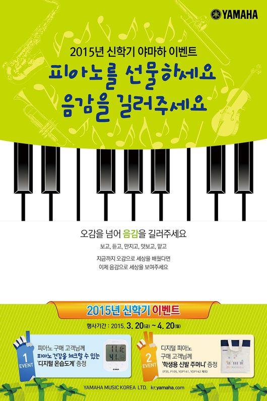 이번 행사를 통해 야마하는 4월 20일까지 전국 대리점에서 피아노, 디지털피아노, 바이올린, 플루트, 클라리넷, 색소폰, 키보드 등의 인기 품목을 특별가에 판매하고, 방문객을 대상으로 피아노 구매 시 온도와 습도에 민감한 피아노의 상태를 수시로 체크할 수 있는 '디지털 온습도계'를, 관현악기 200만 원 이상 구매 시 야마하 멜로디언 '피아니카'를, 디지털 피아노 또는 관현악기 200만원 미만 구매 시 '학생용 신발 주머니'를 사은품으로 증정할 예정이다.