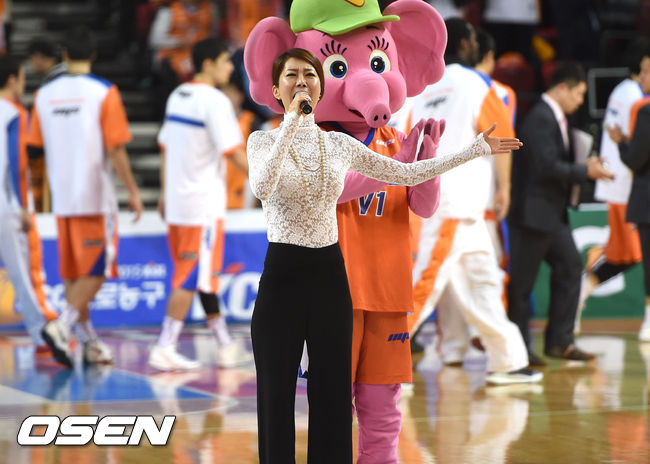 23일 오후 인천 삼산월드체육관서 열린 2014-2015 KCC 프로농구 4강 플레이오프 3차전 인천 전자랜드와 원주 동부의 경기에 앞서 도시락 밴드 정영주가 애국가를 부르고 있다.