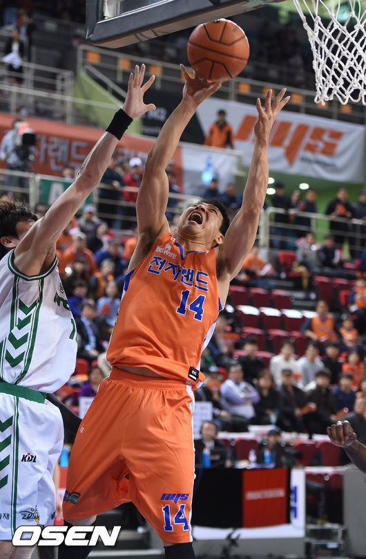 23일 오후 인천 삼산월드체육관서 열린 2014-2015 KCC 프로농구 4강 플레이오프 3차전 인천 전자랜드와 원주 동부의 경기, 2쿼터 전자랜드 이현호가 슛을 성공시키고 있다.