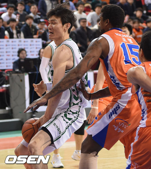 23일 오후 인천 삼산월드체육관서 열린 2014-2015 KCC 프로농구 4강 플레이오프 3차전 인천 전자랜드와 원주 동부의 경기, 3쿼터 동부 김주성이 볼을 놓치고 있다.