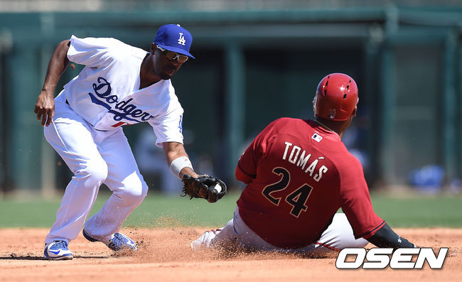 2회초 1사 1루 다저스 롤린스가 2루 도루를 시도하는 야스마니 토마스를 아웃 시키고 있다.