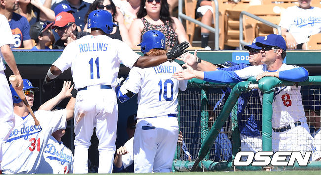 3회말 1사 3루 다저스 매팅리 감독이 득점과 타점을 올린 롤린스, 터너와 하이파이브를 하고 있다.