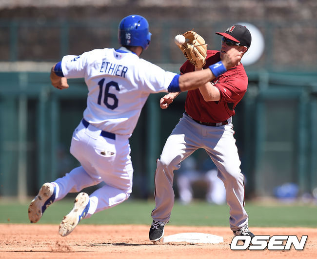 2회말 2사 1루 애리조나 아론 힐이 2루 도루를 시도하는 다저스 이디어를 아웃 시키고 있다.
