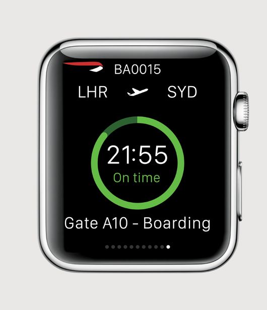 글랜스 스크린을 넘기면 영국항공 애플리케이션이 열리고, 애플워치 스크린에 맞춰 쉽고 빠르게 이용할 수 있게 된다. 이 애플리케이션은 탑승객의 다음 비행, 항공편 명, 경로, 출발 시간, 비행 상황, 출발 시간 카운트다운 및 도착지 날씨 등도 알려준다.
