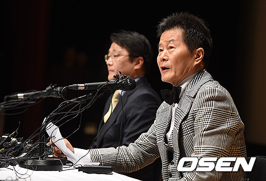 태진아가 기자회견을 하며 입장을 밝히고 있다.