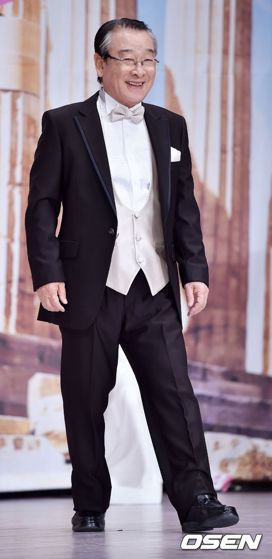 24일 오후 서울 영등포구 63스퀘어 그랜드볼룸에서 열린 tvN ‘꽃보다 할배 in 그리스’(이하 ‘꽃할배’)의 제작보고회, 이순재가 포토타임 중 한걸음 내딪고 있다.