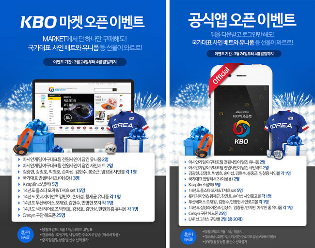 한편 KBO 마켓 리뉴얼 및 앱 출시를 기념하기 위해 KBO 마켓을 통해 물품을 구매한 고객과 앱을 다운로드 받은 고객을 대상으로 2014년 아시안게임 국가대표팀 선수 전원이 사인한 대표팀 유니폼배트, 구단 유니폼, 구단 로고가 담긴 선글라스 및 헤드폰 등의 다양한 경품 행사를 진행한다. KBO 앱은 안드로이드용 OS 경우 구글Play스토어 검색창에서 “KBO”를 입력하고 다운로드 받을 수 있으며 iOS용은 애플앱스토어에서 추후 출시 예정이다.