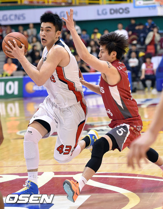 24일 오후 경남 창원실내체육관에서 열린 2014-15시즌 프로농구 4강 플레이오프 창원 LG와 울산 모비스의 경기,2쿼터 LG 김시래가 모비스 이대성을 수비하고 있다.