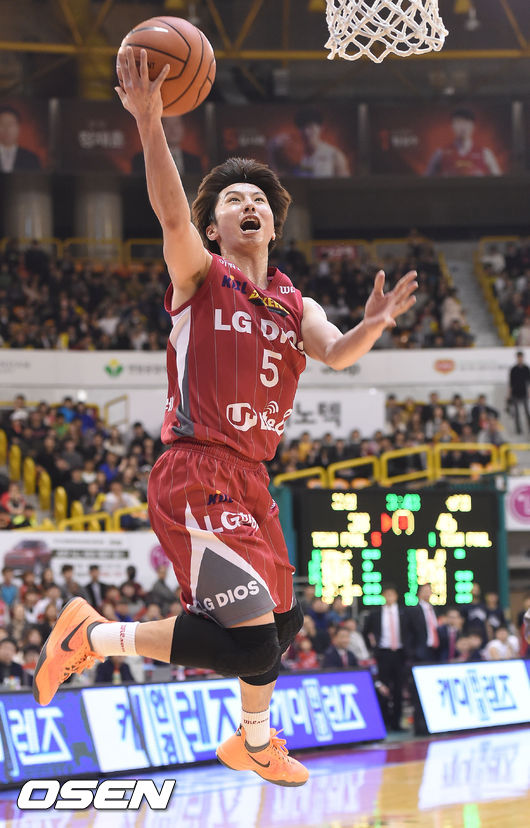 24일 오후 경남 창원실내체육관에서 열린 2014-15시즌 프로농구 4강 플레이오프 창원 LG와 울산 모비스의 경기, 3쿼터 LG 김시래가 레이업슛을 성공시키고 있다.