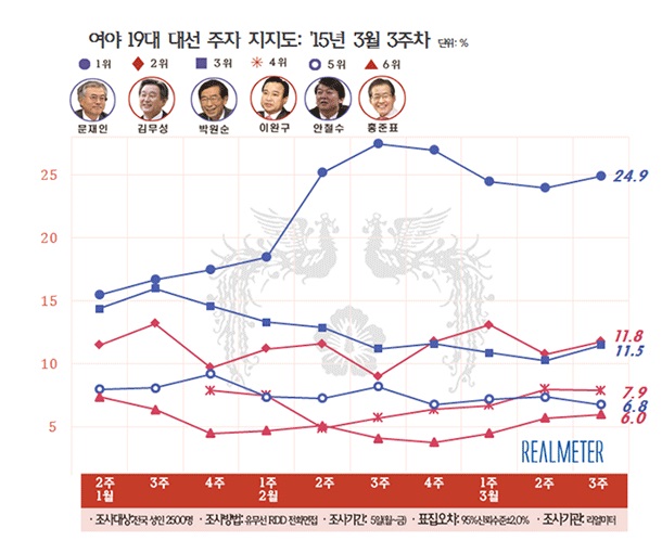 여론조사 전문기관 리얼미터의 올해 3월 3주차(16~20일) 주간집계 결과에 따르면 문재인 대표가 지난 3주간의 하락세를 마감하고 0.9%p 반등하며 24.9%를 기록, 11주 연속 선두를 이어갔다.