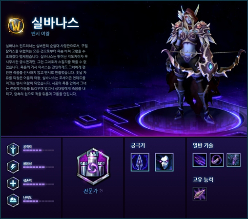 실바나스는 원거리 전문가로 포탑과 돌격병을 타락시키고 무력화하는 것은 물론 다수의 적에게 피해를 주는 다양한 기술을 가지고 있어 팀에서 전략적인 역할을 수행할 예정이다.