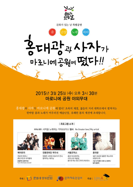 ‘문화광장’ 사업은 거리·광장 등 시민들이 즐겨 찾는 야외공간에서의 문화 프로그램을 지원하는 사업으로, 이번 달에는 세종시 호수공원과 대학로 마로니에 공원에서 각각 공연이 열린다. 특히 이날 마로니에 공원에서는 오후 3시 30분에 전통연희단 연희단 꼭두쇠, 가수 홍대광 등이 참여하는 ‘봄맞이 콘서트’가, 오후 7시에 프라임필하모닉오케스트라와 함께하는 ‘친숙한 뮤지컬 음악여행’이 각각 시민들을 찾아가, 따뜻한 봄을 선사한다.