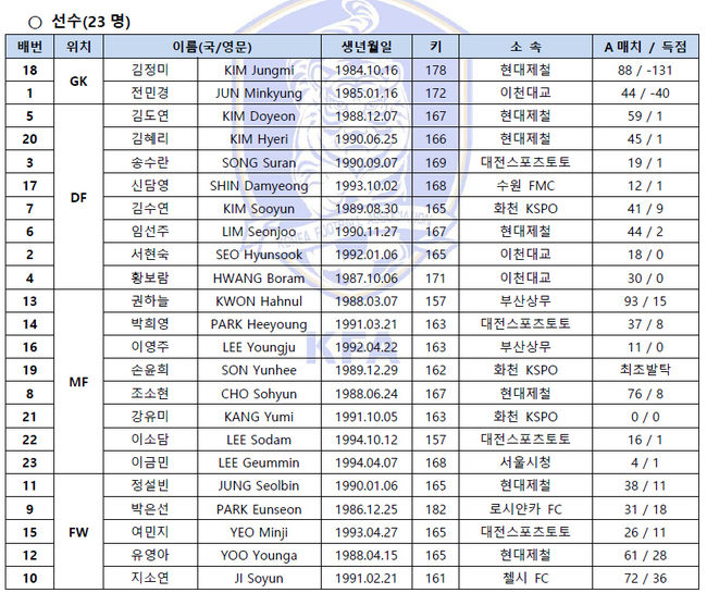 이번 소집에는 전가을(현대제철), 심서연(이천대교)이 부상으로 제외된 가운데 미드필더 손윤희(화천KSPO)가 최초 발탁됐고, 수비수 황보람(이천대교)과 미드필더 강유미(화천KSPO) 등이 오랜만에 대표팀에 소집돼 신선한 바람을 불어넣을 것으로 기대하고 있다.