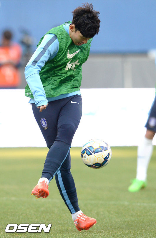 25일 오후 대전월드컵경기장서 진행된 축구대표팀 오픈 트레이닝에서 손흥민이 볼트래핑을 하고 있다.