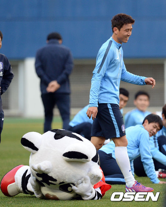 25일 오후 대전월드컵경기장서 진행된 축구대표팀 오픈 트레이닝에서 구자철이 마스코트 백호와 장난을 친뒤 미소 짓고 있다.
