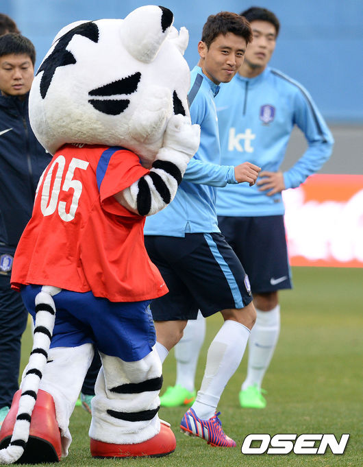 25일 오후 대전월드컵경기장서 진행된 축구대표팀 오픈 트레이닝에서 구자철이 마스코트 백호와 장난을 치고 있다.
