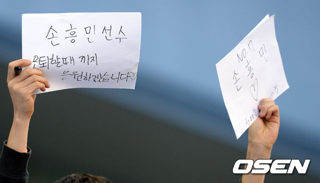25일 오후 대전월드컵경기장서 진행된 축구대표팀 오픈 트레이닝에서 한 남자팬이 손흥민 향한 문구로 응원하고 있다.