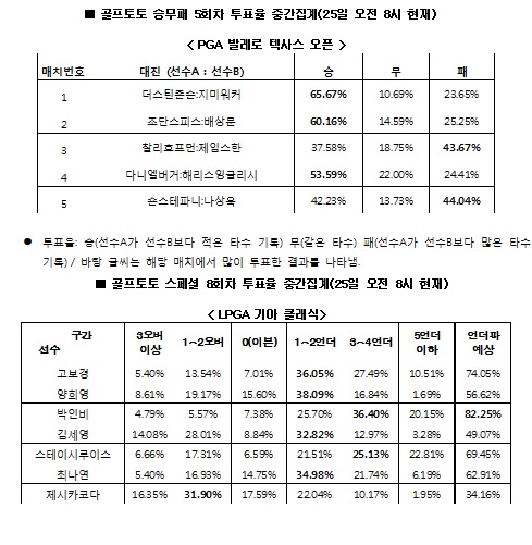 골프 승무패 5회차 게임 투표율을 중간 집계한 결과, 1번 매치에서 65.67%를 기록한 상금랭킹 2위 더스틴 존슨이 23.65%를 획득한 상금랭킹 3위 지미워커보다 적은 타수의 1라운드 경기를 펼칠 것으로 예상한 골프팬들이 많았다.