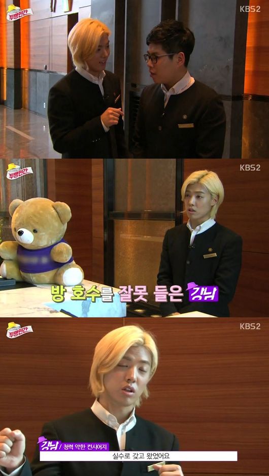 25일 방송된 KBS '투명인간'에서는 호텔리어에 도전한 멤버들의 모습이 그려졌다. 이날 컨시어지 파트에서 일한 강남은 손님이 짐을 내려달라는 전화를 받는다. 그런데 17층을 27층으로 잘 못 듣고 다른 방을 찾아가 짐을 내렸다.