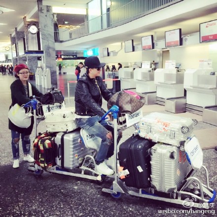 한경은 지난 25일 저녁, 자신의 중국 SNS 웨이보에 "여러분에게 공항 카트 제대로 끄는 법을 알려드릴게요!" 라는 말과 함께 사진을 게재했다.