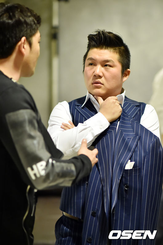 지난 25일 서울 강남구 논현동의 한 스튜디오에서 슈퍼주니어의 강인과 은혁, 김종민, 조세호, 엔(빅스)이 한데 모여 화보촬영을 진행했다. 강인이 조세호와 얘기를 나누고 있다.